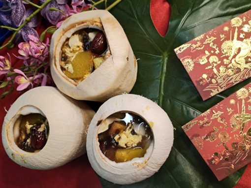 金瓜被认为是一种既美味又富含营养的食材,含有丰富的β胡萝卜素、维生素C和E,而且低热量又容易带来饱腹感。在这道羹里,金瓜可以替代主食。椰水的香甜为这一道羹增色不少。椰肉含有蛋白质、碳水化合物,椰水则含有糖分、维生素B和C,以及微量元素如钾、镁等。
