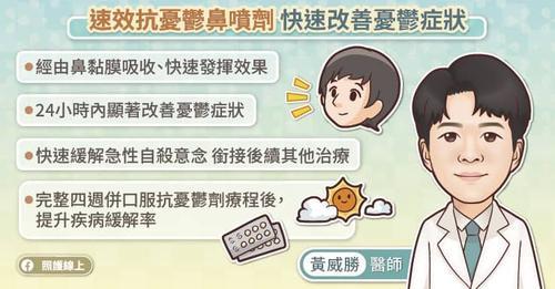 目前有速效抗忧郁鼻喷剂,采用鼻喷方式,经黏膜快速吸收,可以在24小时内改善急性忧郁症状,缓解自杀意念。国际大型临床试验的结果显示,过半数的患者在完整4周的鼻喷剂合并口服抗忧郁剂疗程后,症状可改善至正常,亦有高达75%患者可改善超过一半。