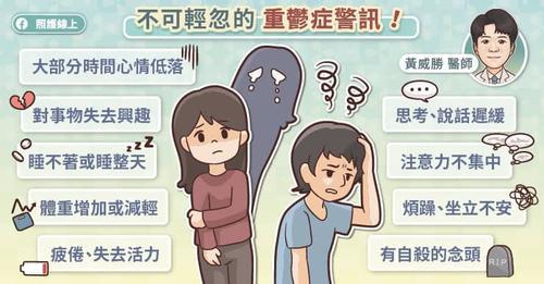 部分患者在出现自杀念头前,会有可观察到的行为或情绪改变,但也有些患者完全没有明显征兆。黄威胜医生说,可能的“预警行为”包括整理私人物品与财物、留遗书或交代身后事等;在社群媒体上发布异常讯号,例如张贴告别、回顾过往等遗言性文字或照片;突然与亲友联系,主动表达道别或感谢;原本情绪低落,却突然变得异常冷静,情绪反转变动不定。若发现相关迹象,请提高警觉,主动关心并尽速寻求医疗帮助!